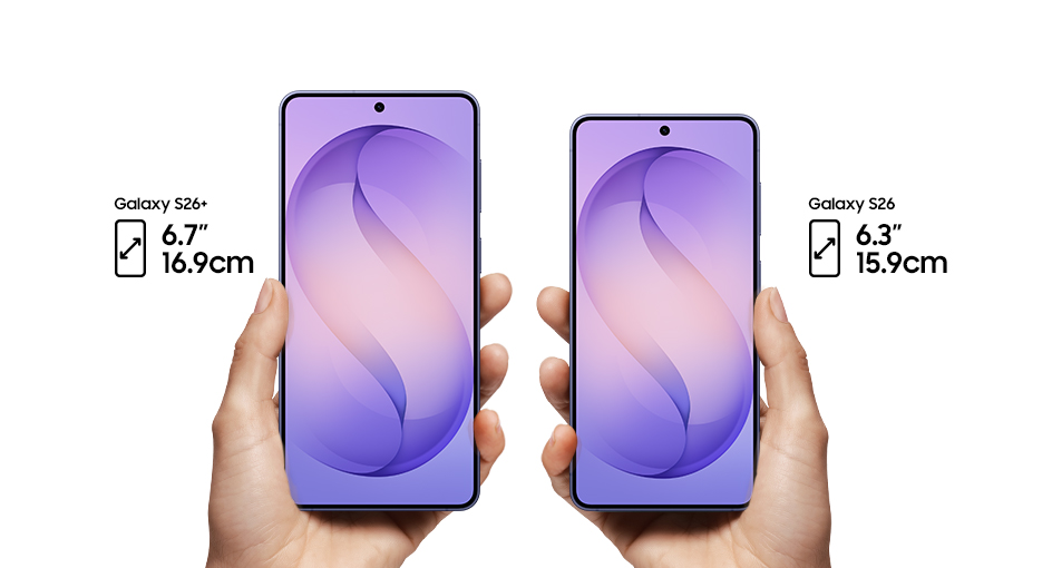 A. Galaxy S26 and S26+ are similar models in features, design and performance, with the difference being that Galaxy S26+ has a bigger display and a larger battery capacity than Galaxy S26.<br> • Galaxy S26+ has a 6.7-inch display and a typical battery capacity of 4900 mAh.<br> • Galaxy S26 has a 6.3-inch display and a typical battery capacity of 4300 mAh.<br> <br> *Measured diagonally, Galaxy S26's screen size is 6.3” in the full rectangle and 6.1” accounting for the rounded corners, and Galaxy S26+'s screen size is 6.7” in the full rectangle and 6.5” accounting for the rounded corners; actual viewable area is less due to the rounded corners and camera hole.<br> *Typical value tested under third-party laboratory condition. Typical value is the estimated average value considering the deviation in battery capacity among the battery samples tested under IEC 61960 standard. Rated capacity is 4175 mAh for Galaxy S26 and 4755 mAh for Galaxy S26+.